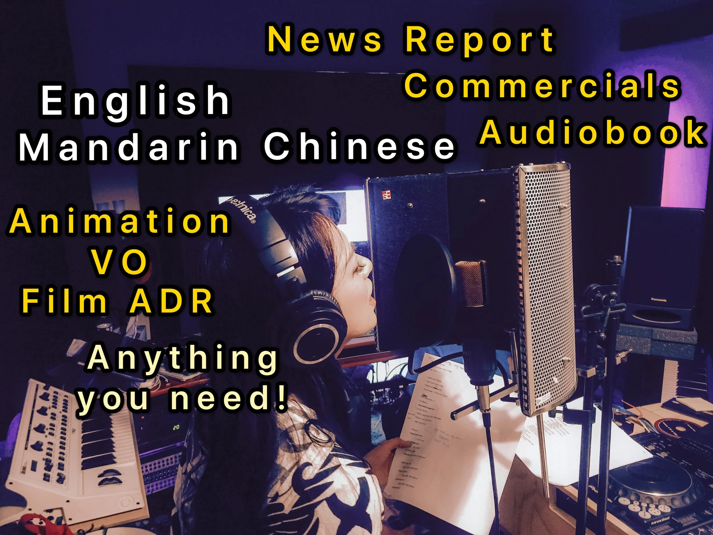 My state-of-the-art home studio is equipped with : Rode NT1 Studio condenser microphone, Focusrite Scarlett Solo (3rd Gen), and Macbook Pro 2024.
